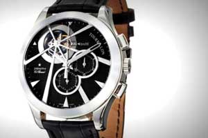 Zenith round shape watch is a favorite watch of many rich businessmen. The watch features an anti reflective sapphire Dial window and case material made with white gold. The diameter of this case is 45millimeters and thickness is 15 millimeters. Band material is developed with expensive crocodile leather. The Band measures 7.5 inch long and 22 millimeters wide. Both the band and the dial are of rich black color.