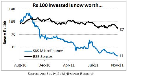 100 in SKS when the shares were listed in August 2010, you would be ruing at your decision. This is given that your investment of Rs 100 would’ve stood 89 percent down, or at just