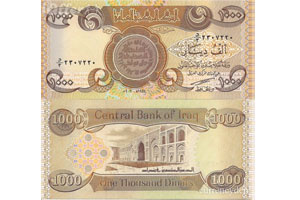 Dinar is the currency of Iraq and was introduced into circulation in 1932, by replacing the Indian rupee, which was then the official currency of Iraq, since the British traded in the country during World War I, at a rate of 1 dinar = 11 rupees. The 1,000 Dinars bill has raised lettering which gives it a unique texture and are printed with inks that are visible only under ultraviolet light.