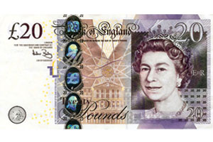 The newest British £20 entered circulation on 13 March 2007. The notes include enhanced security features such as, a prominent holographic strip. When the note is tilted, one hologram strip shows a multi-coloured image of the Scottish economist Adam Smith, the other strips alternates between multi-coloured pound symbol and the figure 20. If the note is passed through ultra-violet light, the figure 20 will appear in bright red and green colours.