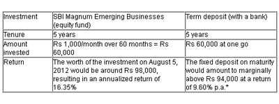 60,000, the investment in the fund scored because you did not have to put down that amount at one go. There was no strain on your finances. Instead, you disciplined yourself into investing every month over 60 months! In the case of the fixed deposit, you had to part with that much of cash at one instance.