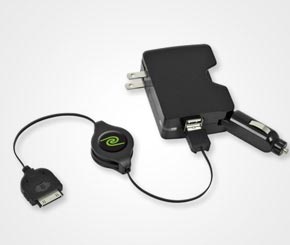 ReTrak dual USB charger has a flip-out wall plug and a car charger along with a retractable USB cord with a 30-pin connector for Apple devices. There are two USB 2.0 ports on the charger: One for devices that needs up to 1 amp of power and the other to deliver up to 2.1 amps and comes with a price tag of $18.