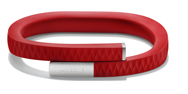 Jawbone UP is a fitness tracking wristband that monitors calories, steps and distance travelled. The circular bracelet shaped device has a silver square button on one end and a 3.5mm headphone plug on the opposite tip.