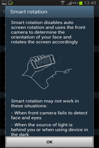 However Samsung’s Smart Rotation technology prevents this accidental rotation using its front camera. When the phone is tilted sideways it "looks" at the user's face to see if it indicates an accidental tilting. If so it prevents the display from rotating, keeping it the way the user wants it even though tilted.