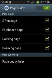 There are four special pages that make up Page Buddy: one that opens when you remove the S Pen from the device; one that opens when you plug in headphones; one when you drop your phone in a dock; and another that opens when you are roaming outside your home area. Each page buddy has its own specific app icons that are useful in that mode.