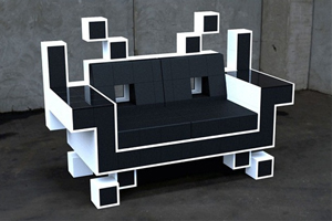 The couch is designed and made by Chak was inspired by the aliens from Space Invaders in 1978. The design of the couch is has alien and retro feel to it. The couch is black and has a white edging to it. The couch is quite comfortable and it comes with a leather covering.