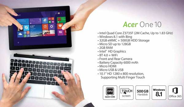 Acer's 2-in-1 touchscreen laptop is powered with an Intel Quad Core Baytrail Processor, this 2-in-1 laptop is rich with multiple features. It comes with dual hard drive, 32GB eMMC ROM integrated in the Tablet and additionally 500GB HDD integrated with the keyboard dock for the laptop usage. Efficient power saving with the battery that runs for over 16 hours in InstantGo.