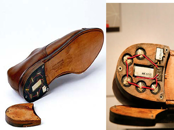 A shoe with a poisoned blade concealed within alongside a transmitter fitted in beneath the shoe. So, now we get it why Bond was able to check-in to any place in the world with full-confidence and no fear.
