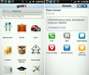 Getit is the most popular app for local information. This App Auto detects your current location using GPS, provides Quick links to top/popular categories, it refines your search based on attributes and location, it shows Interactive Google map with directions. This is also a free app in the Android market.