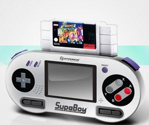 Hyperkin Supaboy is a portable SNES console which comes with a full-size SNES and Super Famicom cartridge, and gives a familiar controller layout with its 3.5-inch screen. It weights around 11.5 ounces and has a battery life of 2.5 hours. The device also has two SNES controller ports and a TV-out port. This console is available with a price tag of