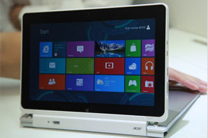 Acer Iconia W510 sports a 10.1 inch screen with a full HD 10.1-inch IPS display with a resolution of 1920×1280 pixels. The device features SIM card slot, USB 2.0 port, MicroSD slot, MicroUSB, HDMI ports and gives 18 hours of battery life when used with keyboard. It comes in a convertible form factor; it can be used with standard tablet style, turns into a laptop when docked with a detachable keyboard and runs in a presentation mode if you rotate it 295 degrees with the dock.