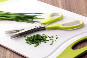 A stainless steel Scissors that has five blades, quickly chops your vegetable without much effort.