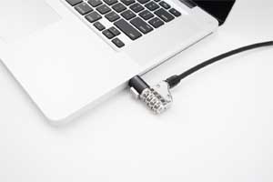 cable. It gets a key or a combination lock. The popular manufacturers for these are Targus and Kensington.