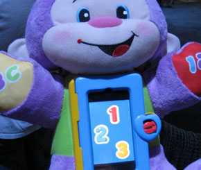 Fisher-Price Laugh & Learn Apptivity Monkey is a plush toy with an iPhone or iPod touch case rooted in its belly. You just have to download the free app and place the smart device in the well protected monkey's case, now your child can interact with the app by squeezing the monkey's paws to learn about numbers, letters, colors, and more. Kids can listen to songs and phrases even without the smart device. This monkey will hit the stores by July with a price tag of around $29.99.