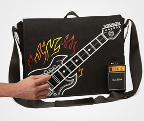 ThinkGeek's Electronic Guitar Bag lets you play songs while you carry your laptops and other stuffs. Playing your thumb across the fingerboard will play actual chords and songs. This singing bag will cost you $19.99.