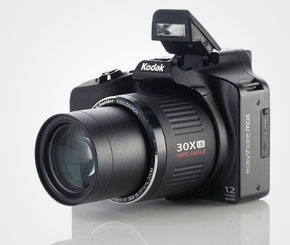 Kodak has not made much impact in the camera market but it is well known for its imaging materials. The Kodak Easyshare Max Z990 looks like a small D-SLR and has a full featured camera with a very long 30x optical ultra zoom lens.