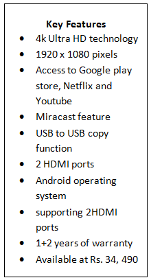 HDMI ports, Wi-Fi, makes this TV to emerge as a distinct face.Being an Android smart TV,access numerous inbuilt reckoned, online and offline apps namely.