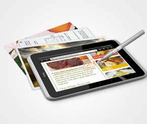 HTC Flyer has a unique digital pen which is made of N-trig technology and can be used for marking screen grabs, explain documents, and create notes with coordinated audio recording and playback. HTC Flyer is powered by Intel 1.5 GHz processor with Android 2.3.3 Gingerbread operating system and 1GB of RAM. It also sports a 10.1 inche screen with 1280 x 800 pixels resolution, a 5.0 Mega Pixels camera, a 1.3 Mega Pixels secondary camera for video calling and chatting, an internal memory of 32 GB and supports up to 32 GB microSD Card Slot. This impressive tablet is available for