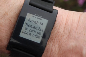 This is a smartwatch which comes with apps and can be synchronized with your iPhone or Android smartphone. It can also be synchronized with your tablet using Bluetooth. The device sports a 144 x 168 pixel black and white e-paper display, vibrating motor, 3 axis accelerometer with gesture detection and distributes apps via Pebble watchapp store.
