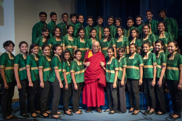 His Holiness the Dalai Lama poses with the Christ University Choir, who performed before his keynote address at an international conference on Bounds of Ethics in a Globalized World hosted by Christ University in Bangalore, Karnataka, India on January 6, 2014