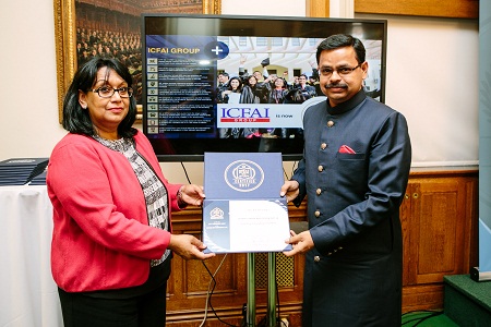 ICFAI has also been recognized as a “Great Place to Study” on 23rd February, 2017 at the historic House of Commons, London, United Kingdom. The award was presented by Baroness Verma, Chairman of Lords European External Affairs Committee and Member of Lords EU Select Committee to ICFAI Group represented by Mr Sudhakar Rao, Director - Branding.