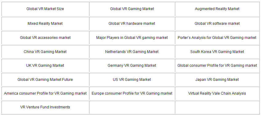 Global VR Gaming market by Type (Hardware, Software and Accessories), by Devices (PC, Consoles and Mobile), by Distribution Channel (Traditional Stores and Online Stores) and by Regions (EMEA, America and APAC), Company Profile of Major players including Sony, Valve Software, HTC, Google, Samsung, Leap Motion, TCL, Nvidia, Ubisoft, Razer Inc., Oculus and Electronics Art Inc.