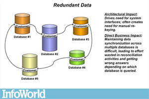 Another sign for bad architecture is redundant data. Different applications might need the same information for different purposes. And also to get this information from the same database makes it harder. So if you are pointing them to the same database then you are asking for trouble, and if you are thinking of synchronizing the databases, then its gets pretty complicated.