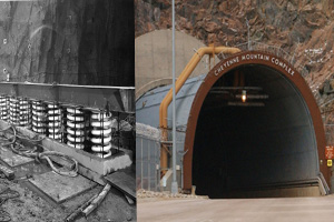 Located half a mile under a granite mountain, Cheyenne Mountain Complex Air Force Station is the most secured, large underground installation in the world. It consists of 15 steel buildings, laid out in a 4.5 acre grid inside the mountain. It is also protected by its natural cover, mountain of granite (an extremely hard rock). The complex can be accessed through a tunnel and a 30 ton blast doors. To absorb the shock of a nuclear detonation, buildings are suspended on, 1,300 47 steel springs. The buildings store 30 days of supplies and six million gallons of water. It is operated by the USA/Canadian, North American Aerospace Defense Command (NORAD), and the U.S. Space Command, which is headquartered in Peterson Air Force Base. Refined work base under the mountains.