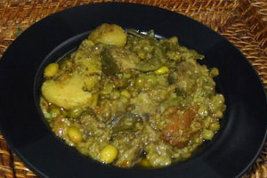 Undhiyu is a delicacy of Gujarat. It is a mixed vegetable dish that is a regional specialty. The name of this food is derived from the Gujarati words "matlu", which means earthen pot and "undhu", which means upside down, as they have been traditionally cooked upside down underground in earthen pots fired from above. The dish is a seasonal one, and includes the vegetables that are available on the South Gujarat coastline during the winter season, including green beans, unripe banana, muthia, and purple yam. These are then cooked in a spicy curry that at times includes coconut.