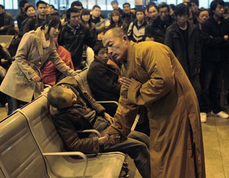 20. A monk prays for an elderly man who had died suddenly while waiting for a train in Shanxi Taiyuan, China.