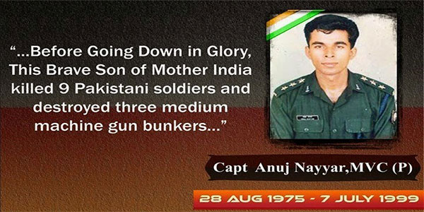 The course of Kargil war has many heroic stories; one among them is exemplary valour of Captain Anuj Nayyar. During the war, the Pimple Complex in Kashmir region was captured by the Pakistani intruders. To recapture the complex, a team led by Anuj Nayyar fought fearlessly and cleared all three bunkers but before attacking the last bunker an enemy grenade detonated near Nayyar, injuring him lethally. Eventually, though team was able to execute all the enemies, including Nayyar all the crew members laid down their lives in the combat.