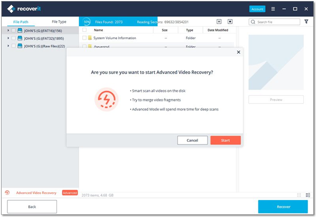 As you launched the Advanced Recovery feature, a pop-out will appear that describes the operation. It will take longer because it's a smart scan that can merge video fragments. Click on "Start" button if you want to proceed.
