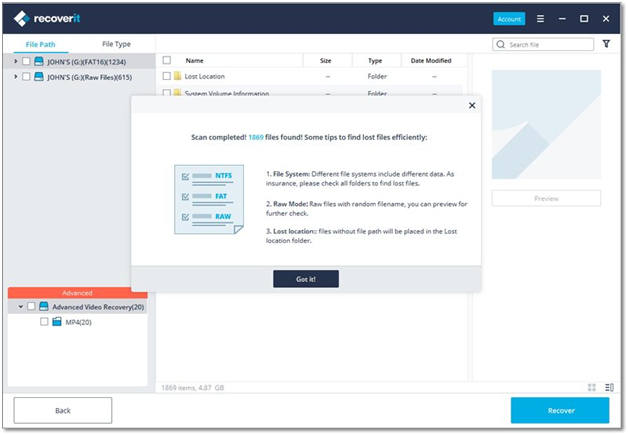 Recoverit allows you to recover lost and deleted complex video in 3 steps and minutes. With Recoverit, you can recover 1000+ data formats and types in multiple devices including, windows, desktop, mac, hard drive, and external devices. This software tool comes with additional video recovery features and recovers videos regardless of complexity and file size.