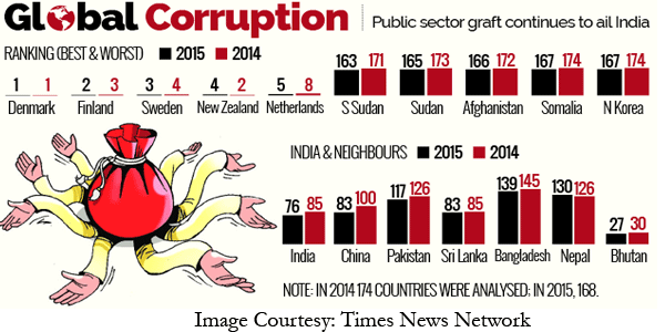 BENGALURU: India improves its ranking in Corruption Perceptions Index (CPI) 2015, moving from 85 to 76th position, as revealed by Transparency International's Corruption Perceptions Index (CPI) 2015, reports TOI.