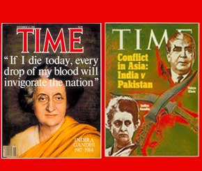 Former Prime Minister Indira Gandhi was on the magazine's cover in its January 28, 1966 issue. She was on the cover again in the magazine's December 6, 1971 issue, sharing space with Pakistan's then President Yahya Khan. The cover is a depiction of the 1971 India-Pakistan war. Later on Gandhi featured again on the magazine's cover after her assassination in the magazine’s November 12, 1984 issue.
