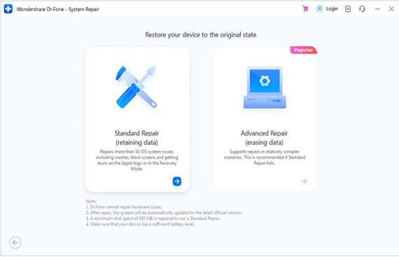 - Starting with Standard Mode in Dr.Fone – iOS System Repair maintains all data while fixing most iOS bugs.
