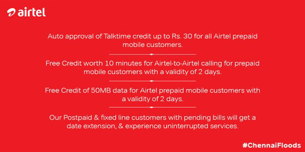 Telecom companies have also jumped in to offer help to the rain affected Chennai. All the Airtel prepaid users can avail for the free recharge of talk-time worth
