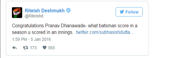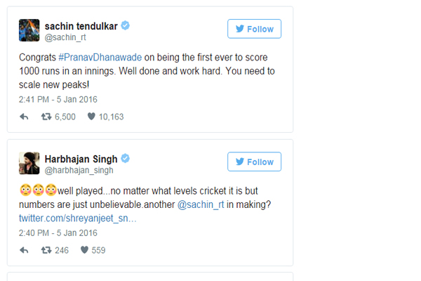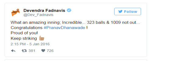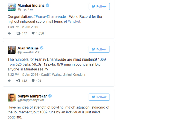 BANGALORE: 15year old son of an auto-rickshaw driver left the nation awe-struck hitting an unbelievable 1009 not-out at an inter-school tournament. Mumbai Cricket Association organized Bhandari Cup inter-school cricket tournament where a young Indian school boy entered the history books. The young cricketer, Pranav Dhanawade, set a record achieving this virtually impossible score and became the first ever cricketer to have hit a four-figure score. It is evident that his incredible career has just begun, reports Indian Express.