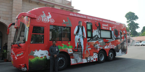 2 crore. The bus is built by a Chandigarh- based company JCBL, which had earlier designed a mine-proof and bullet proof bus for Andra Pradesh Chief Minister Chandrababu Naidu as well as his counterpart K Chandrashekar Rao. The red Mercedes rath has a hydraulic lift that will zip the Chief Minister to the roof to address the crowd. To address the public, a public address system is also included along with the collections of campaigning songs played during the rath yatra.