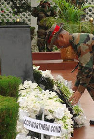 Srinagar: The Army paid tribute to Lt Navdeep Singh who died in a gunbattle in which 12 infiltrating militants were killed in Gurez sector of north Kashmir. General Officer Commanding (GOC) of the Army's Srinagar- based 15 Corps Lt Gen Syed Atta Hasnain paid floral tributes to the 26-year-old officer who died in the encounter yesterday. Singh was commissioned in March this year in the Army Ordnance Corps and was serving in 15th Battalion of the Maratha Light Infantry.