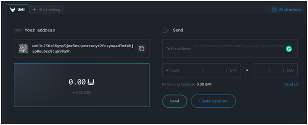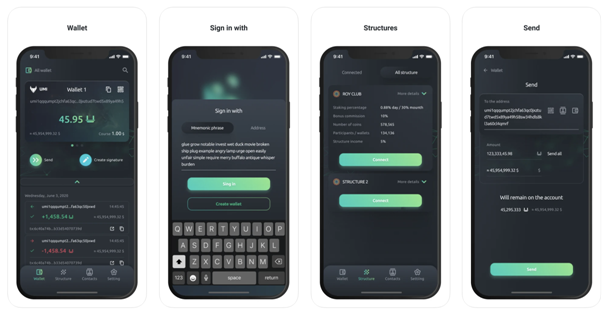UMI mobile apps offer a wide list of functions. One can create and manage one or several UMI wallets, receive and send coins, connect to staking structures, view the history of transactions and get in touch with technical support.