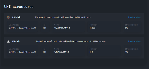 Currently, UMI coins can be mined in two staking structures (pools) - ROY Club and ISP Club. In order to start mining you need to create a personal wallet in the UMI blockchain and transfer a certain amount of UMI coins to your address.