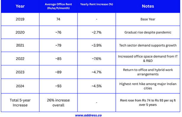 Data shows commercial rents have jumped by nearly 26% in five years, moving from ₹74 per sq.ft in 2019 to ₹93 per sq.ft in 2024. That steady rise places Bangalore among the costliest cities in the country for office space.