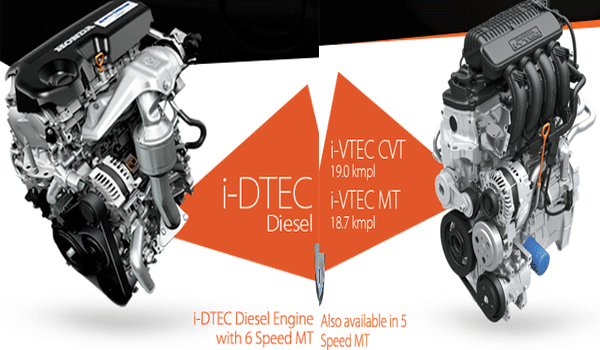 i-DTEC Diesel Engine - has been exclusively made available for the Indian market. This engine delivers a maximum power of 100 PSat the rate of 3,600 RPM. This engine offers a ARAI certified fuel economy of 27.3 Kmpl, which is second best to Maruti Suzuki Celerio. The engine is mated to a newly-developed six-speed manual transmission.
