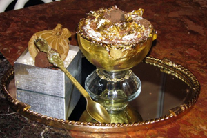 How do you serve a dish such as this one! No ordinary bowl would do. It is served in a goblet which has a crown that is made of gold along with diamonds. Well isn’t this taking it to extremes. Well apparently not because you have to eat the dessert with hold your breath a gold spoon.