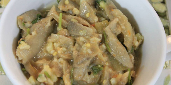 Eromba is a perfect wholesome food of the Manipuri cuisine. It is made of seasonal vegetables cooked with fish and fiery chilies. The smoked flavor of the dish makes it the people’s favorite with plain rice or millet bread.