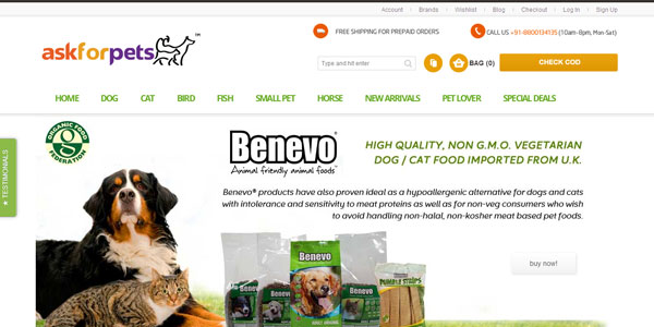 AskForPets is India's first and largest online pet supplies store catering to dogs, cats, birds, fish, small pets and horses. It provides you with a wide range of choices in food and treats, grooming, health and wellness, leashes and collars, pet clothing and supplements.