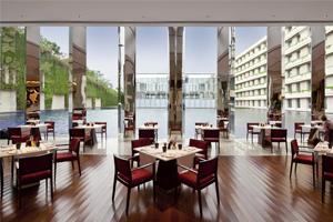 This is one of the largest restaurants in the country with a seating capacity of 210.The tables are not too closely placed, so that you always get some privacy when you hold a quick meeting here. This all-day dining world cuisine restaurant has five show kitchens offering Japanese, Chinese, Italian and Indian cuisine. Two teakwood decks extend from the restaurant into the 36,000 square foot reflection pool offering an amazing dining experience.
