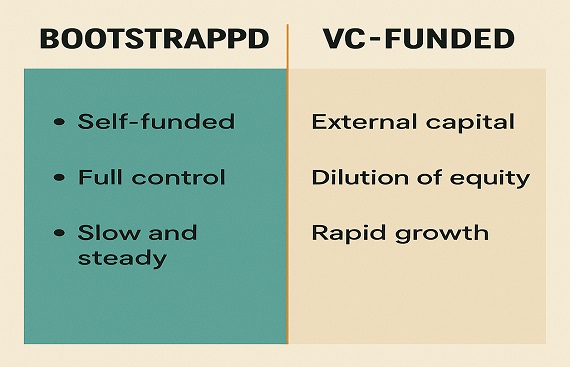 Venture capital, on the other hand, involves raising funds from institutional investors betting on high growth and large returns. It fuels rapid scaling, fast hiring, and market expansion but often at the cost of control, ownership, and a long-term vision.