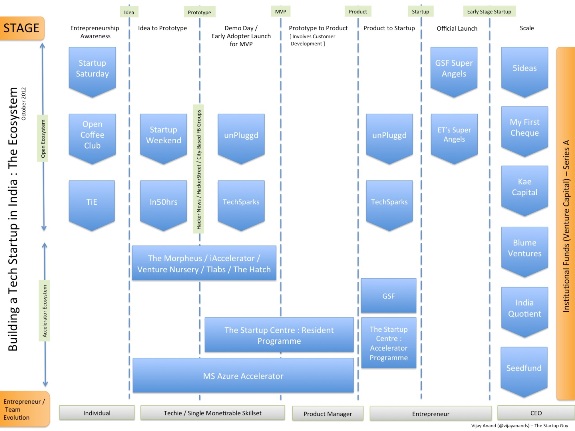 Vijay Anand, founder of The Startup Centre (TSC), did a research on the technology startup ecosystem in our nation. He came up with this infographic which explains in detail the various stages and types of support available to such startups right from the origination of idea to first round of funding.